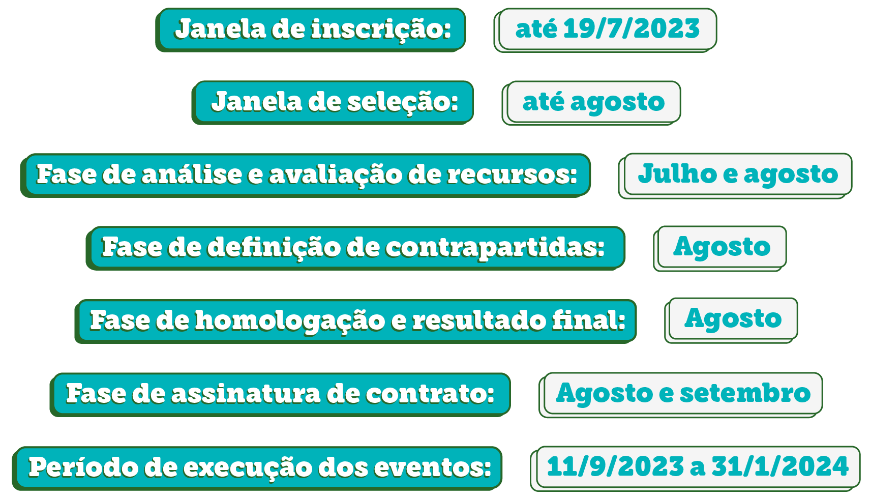 Os eventos contemplados e todas as suas etapas deverão ser executados dentro do Período de Execução previamente estabelecido. O Período de Execução está vinculado às Janela de Inscrição e Seleção respectivas, e é conhecido no mesmo momento de dilvugação das Janelas.