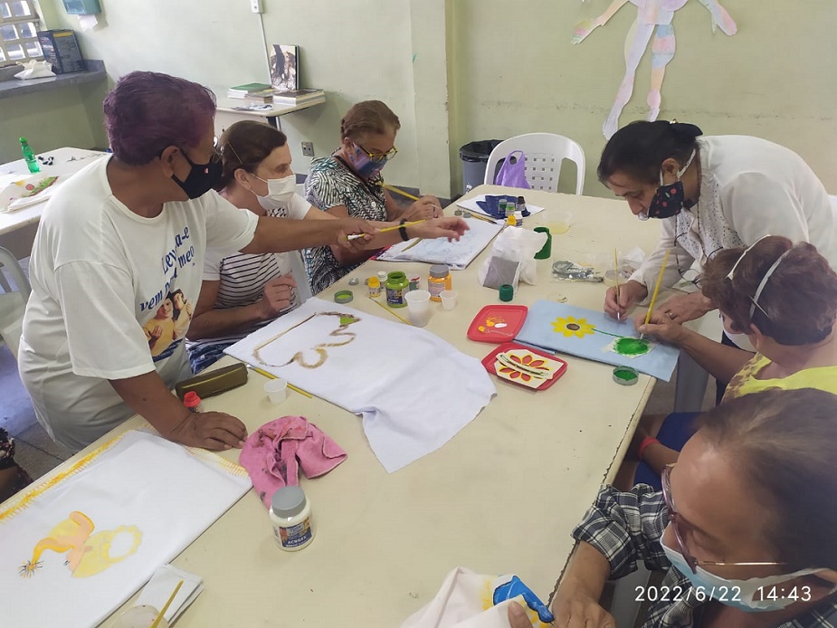 Nesta oficina, D. Odília e Glorinha compartilham suas técnicas de pintura e bordado.