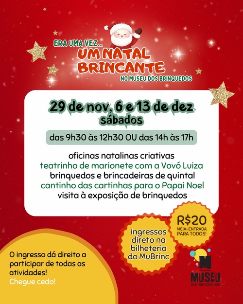 Era uma vez um Natal em que o melhor presente era simplesmente estar junto. Neste fim de ano, o Museu dos Brinquedos convida famílias a viverem o Natal Brincante, uma programação especial que acontece nos dias 29 de novembro e 6 e 13 de dezembro, sempre aos sábados, com atividades pensadas para despertar afeto, imaginação e convivência. Em um ambiente acolhedor que lembra o quintal das antigas brincadeiras, o público encontra oficinas natalinas, teatrinho de marionetes com a Vovó Luiza, brinquedos e jogos tradicionais, um espaço para escrever cartas ao Papai Noel e a visita à exposição de brinquedos de diferentes épocas e culturas.