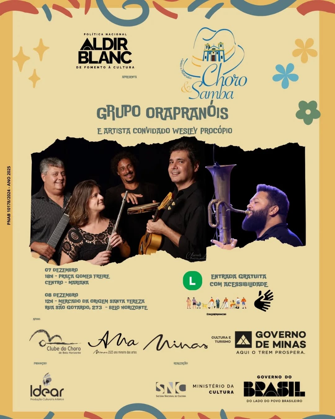 O grupo ORAPRANÓIS é formado por músicos de ampla trajetória na cena musical da capital mineira. Geraldo Magela, no violão de sete cordas, é referência incontornável no choro e no samba. Juliana D’Ávila, flautista virtuose e integrante do Clube do Choro de BH, traz lirismo e precisão. Rodrigo Alonso, cavaquinista e anfitrião de uma das rodas de choro mais tradicionais de Belo Horizonte, agrega versatilidade e energia. Frederico Lazarini, o “Fred”, assume pandeiro, percussões e voz, dando brilho e ritmo ao conjunto. Como convidado especial em ambas as apresentações, o trombonista Wesley Procópio, natural de Mariana e mestrando na UFOP, enriquece o show com sua musicalidade refinada e personalidade sonora.