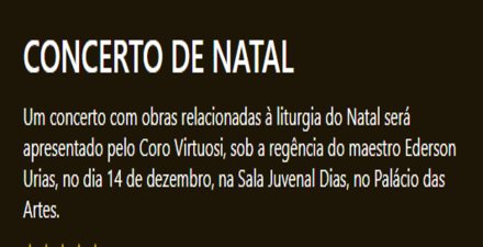 Um concerto com obras relacionadas à liturgia do Natal será apresentado pelo Coro Virtuosi, sob a regência do maestro Ederson Urias, no dia 14 de dezembro, na Sala Juvenal Dias, no Palácio das Artes. Serão duas sessões, às 17h30 e 20h. Os ingressos estão à venda no site da Eventim e nas bilheterias do Palácio das Artes.