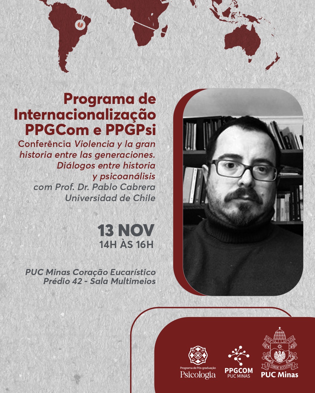 Os Programas de Pós-graduação em Comunicação Social (PPGCom) e em Psicologia (PPGPsi) da PUC Minas realiza, no dia 13 de novembro, a conferência “Violencia y la gran historia entre las generaciones. Diálogos entre historia y psicoanálisis”, com o professor Dr. Pablo Cabrera, da Universidad de Chile.
