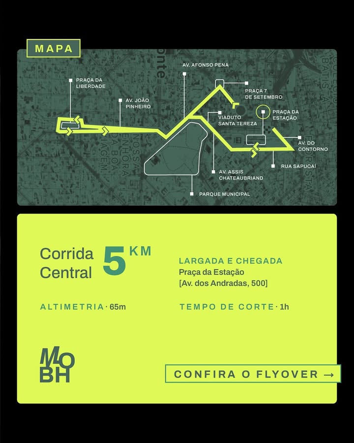 Já a prova de 5km foi antecipada para a sexta-feira (15/5), em formato night run. A ideia é que o percurso passe por diversos pontos turísticos da cidade. A largada será na Avenida Amazonas com Praça Rui Barbosa, seguindo até a curva à direita na Avenida Afonso Pena no Pirulito da Praça 7. Na sequência, segue até a Praça Afonso Arinos, onde entra na Avenida João Pinheiro, subindo até a Praça da Liberdade. Aí então, contorna e desce de volta na Avenida João Pinheiro até a Afonso Pena, vira na Rua da Bahia, entra no Viaduto Santa Tereza, segue pela rua Sapucaí até o Viaduto Floresta e chega à Praça da Estação.