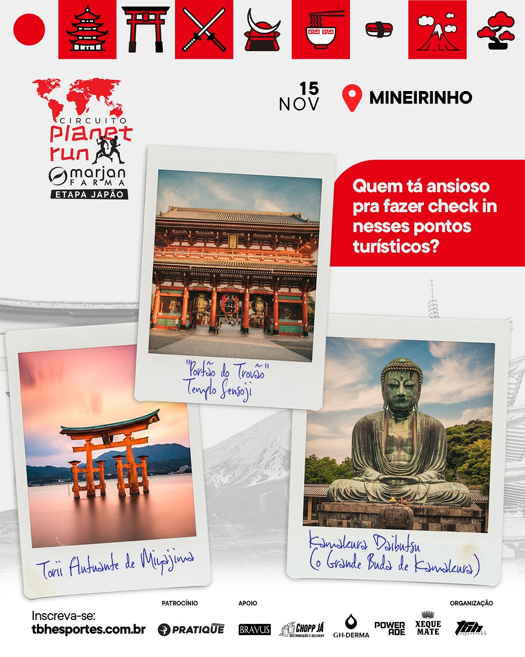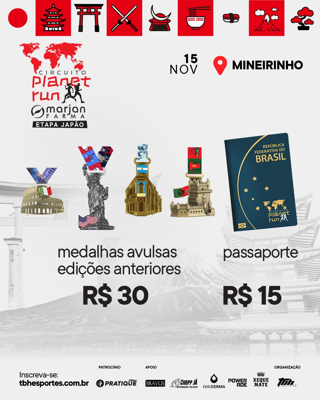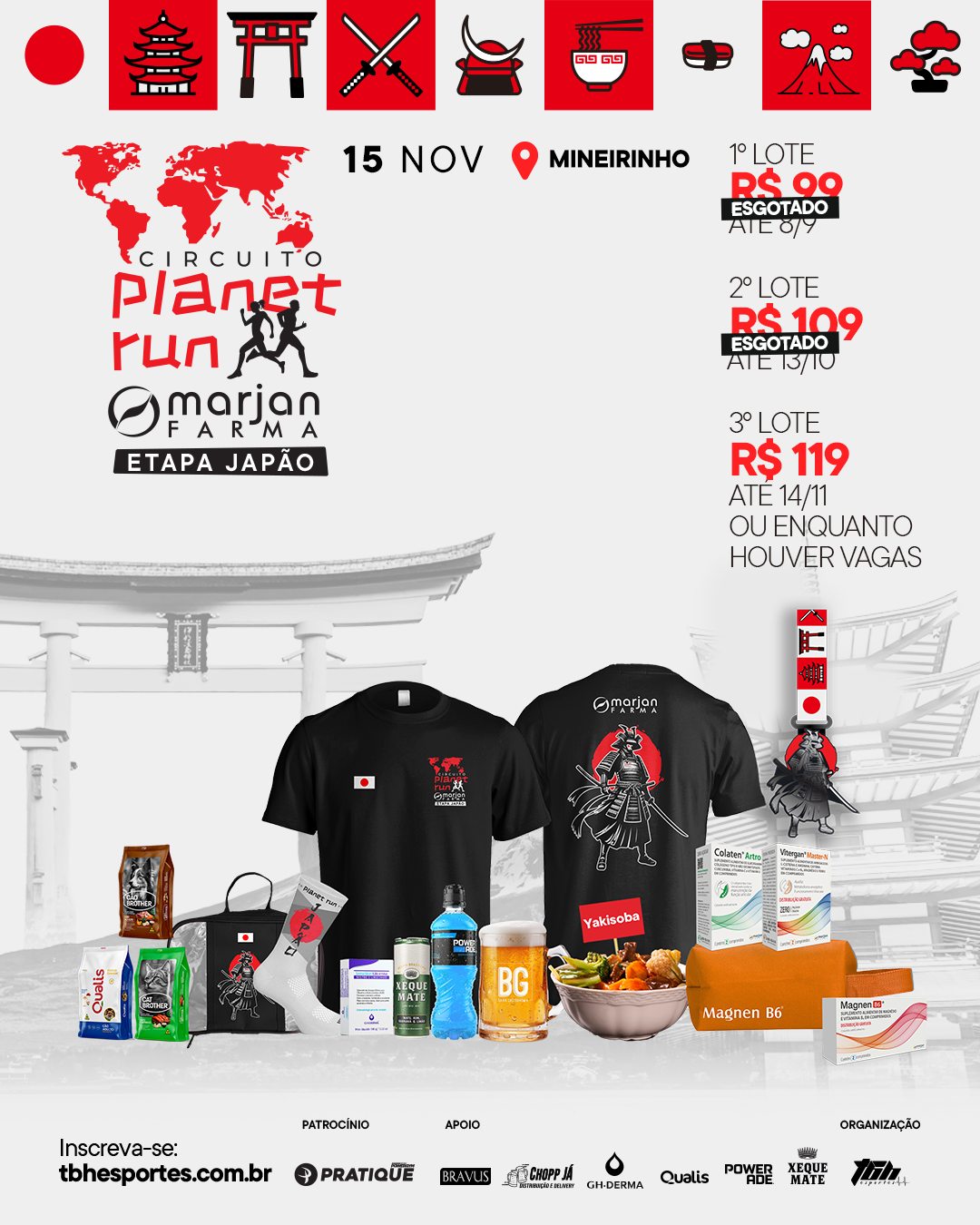O Evento Esportivo "Circuito Planet Run 2025 - Etapa Japão", será no dia 15 de Novembro de 2025, com largadas e chegadas no Mineirinho - Avenida Antônio Abrahão Caram, 1000 - Pampulha.
