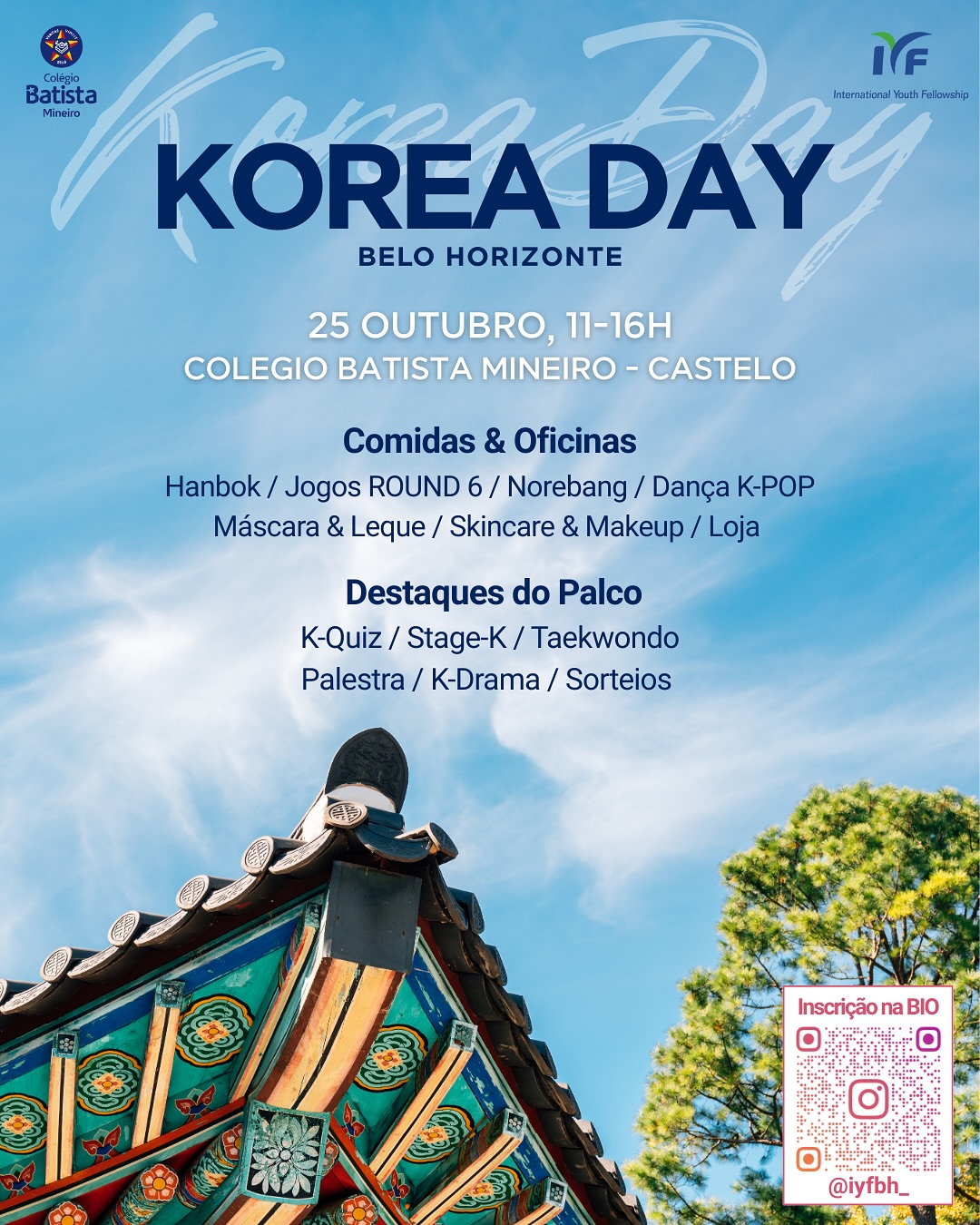 No dia 25 de outubro (sábado), a partir das 11h, o Korea Day está de volta a Belo Horizonte — atendendo a muitos pedidos do público! Prepare-se para viver novamente toda a magia, energia e charme da Coreia do Sul bem pertinho de você!