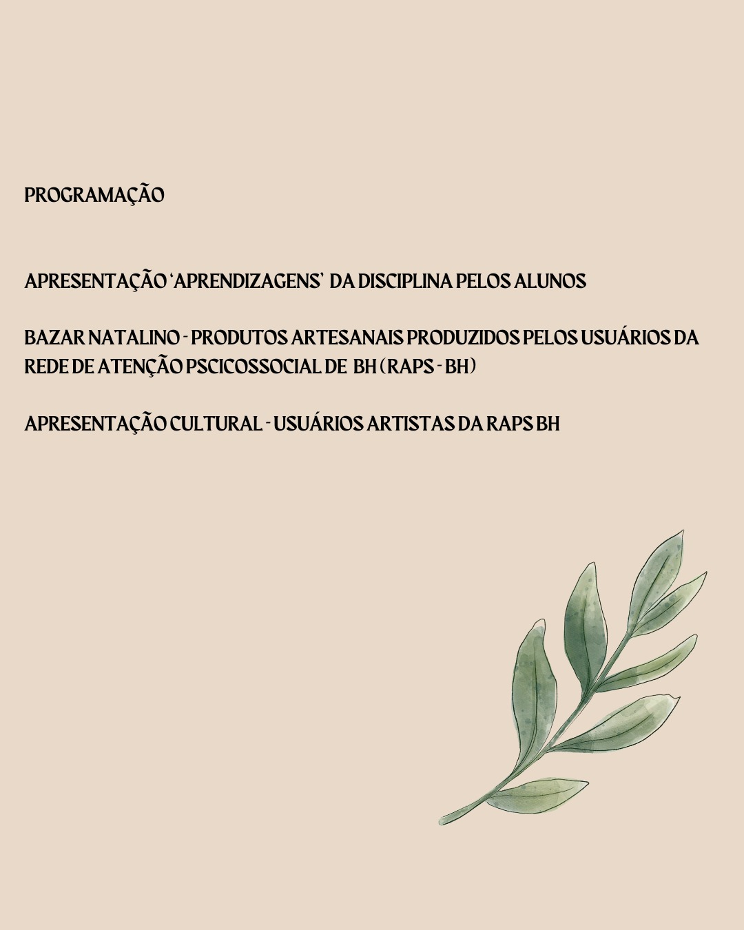 A iniciativa acontecerá no dia 4 de dezembro, nos pilotis e andares da Escola de Enfermagem da UFMG, das nove ao meio-dia, reunindo apresentações dos alunos, um bazar natalino com produtos artesanais elaborados por usuários da rede de saúde mental da cidade e uma mostra cultural com artistas que também integram esses serviços.