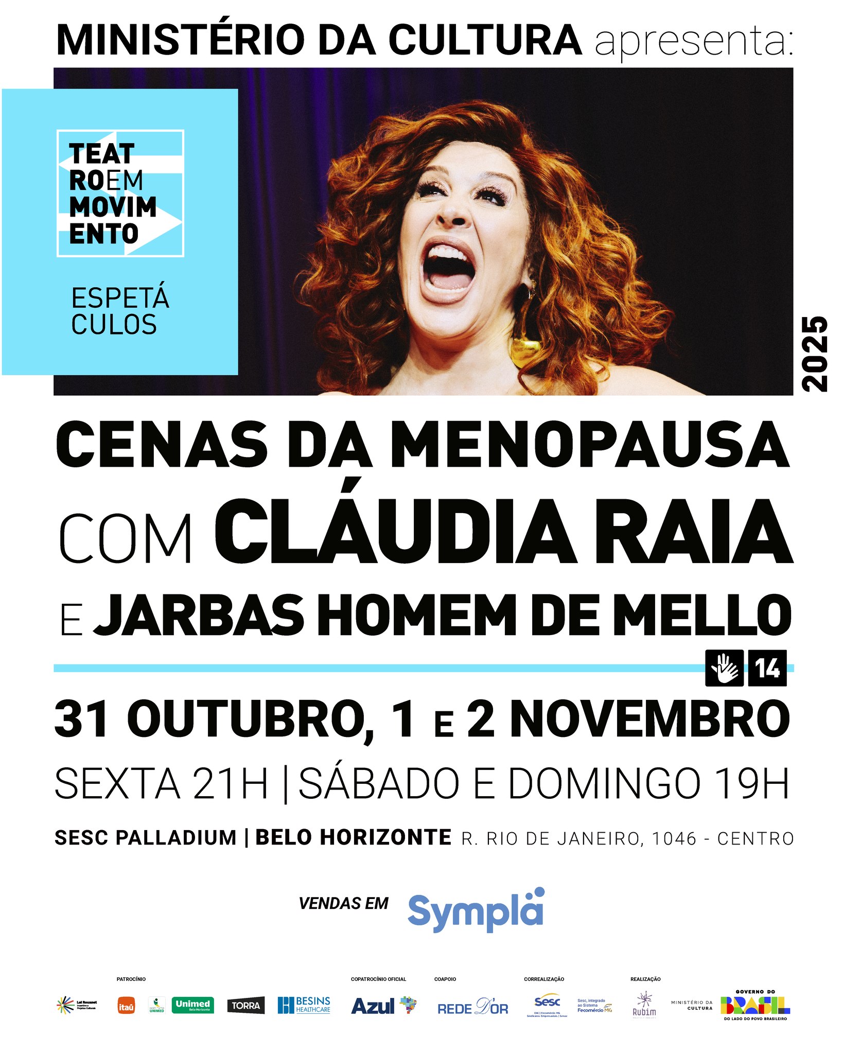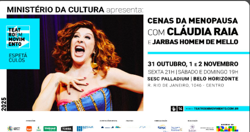 O espetáculo é uma comédia que retrata, com humor e sensibilidade, a vida da mulher 50+ no “segundo ato” da vida. Por meio de cenas curtas e paródias musicais, a montagem aborda temas como mudanças corporais, carreira, saúde, beleza, relacionamentos e a menopausa, de forma franca, divertida e reflexiva. A capital mineira recebe a peça nos dias 31 de outubro, sexta-feira, às 21h, e 1 e 2 de novembro, sábado e domingo, às 19h, no Sesc Palladium. Ingressos à venda pelo Sympla. Essa 24ª edição do Teatro em Movimento é patrocinada pelo Instituto Unimed-BH e Itaú, via Lei Rouanet do Ministério da Cultura.