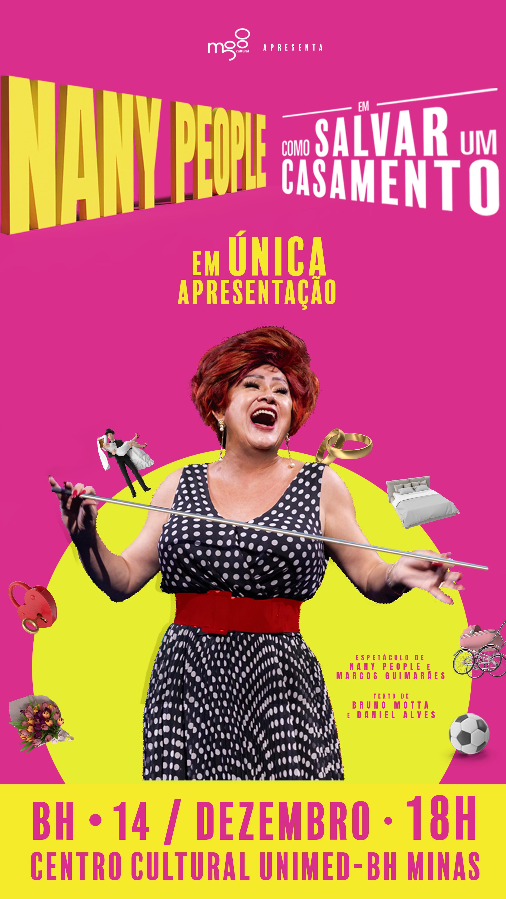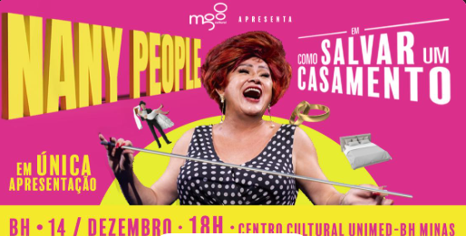 A atriz, humorista e apresentadora Nany People retorna a Belo Horizonte com um de seus espetáculos mais marcantes: “Como Salvar Um Casamento”, que será apresentado no dia 14 de dezembro (domingo), às 18h, no Centro Cultural Unimed- BH Minas.