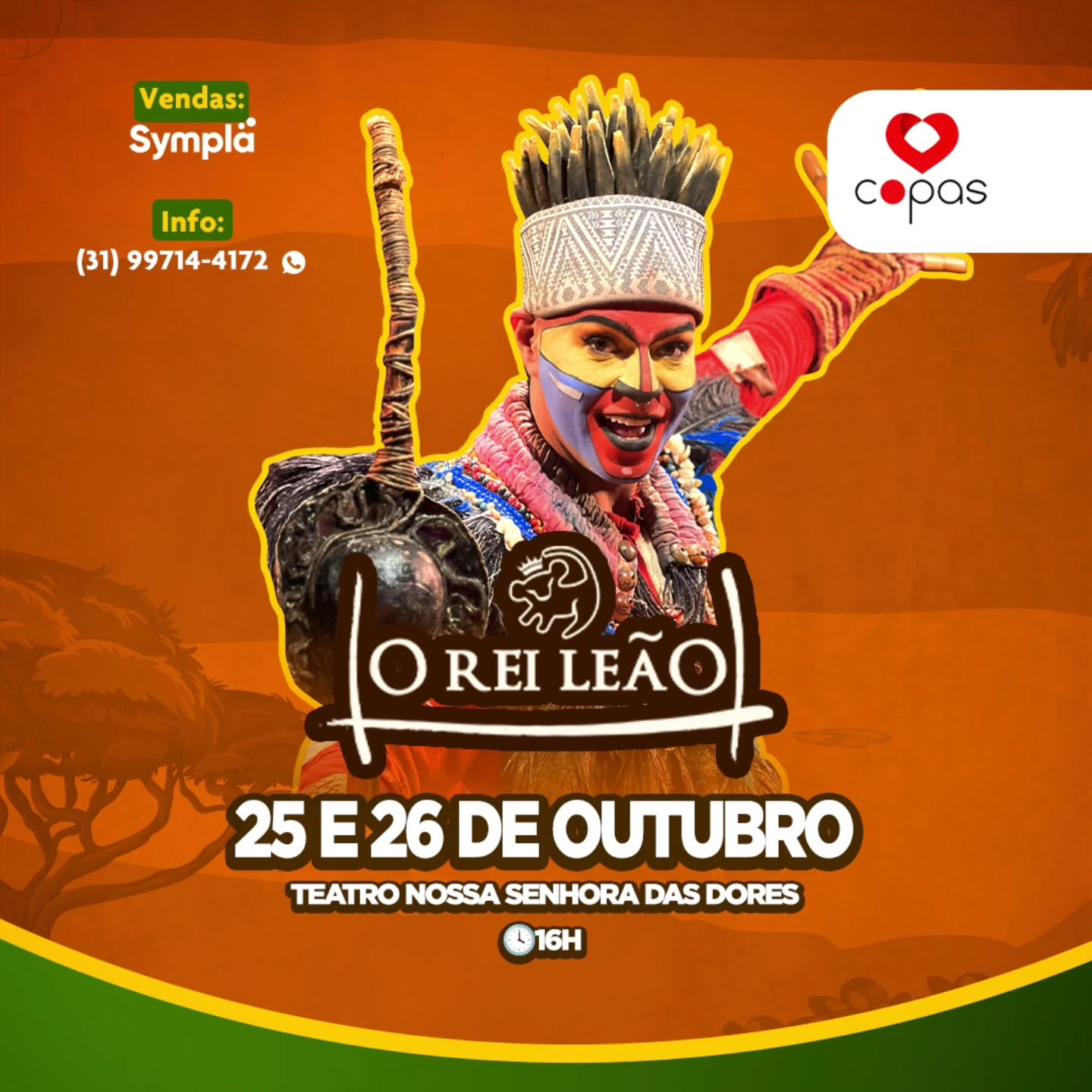 "O Rei Leão", da Copas Produções, é um musical baseado no maior sucesso da Broadway de todos os tempos. Nove atores dão vida ao maior clássico infantil da Disney. Com figurinos e cenários grandiosos, músicas cantadas ao vivo, belas coreografias e efeitos especiais de som e luz, o espetáculo garante diversão para toda família.