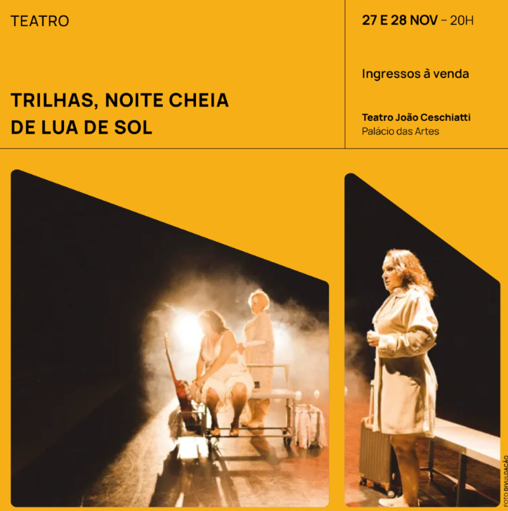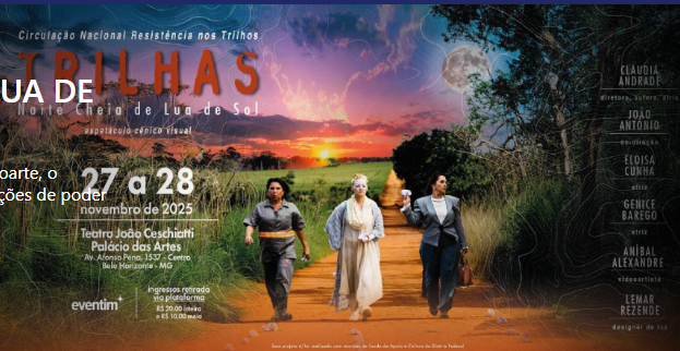 Encenada pela primeira vez em 2022, “Trilhas, Noite Cheia de Lua de Sol” inicia, em 24 de outubro de 2025, a partir do Distrito Federal, circulação nacional. Com texto, direção e atuação de Cláudia Andrade, o espetáculo cênico imagético é atravessado por elementos como a videoarte, música, dramaturgia contemporânea e as artes visuais.