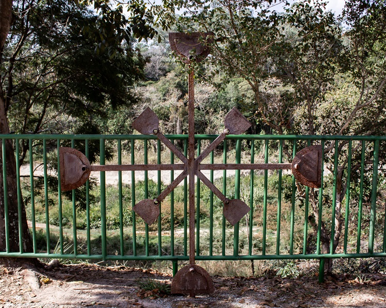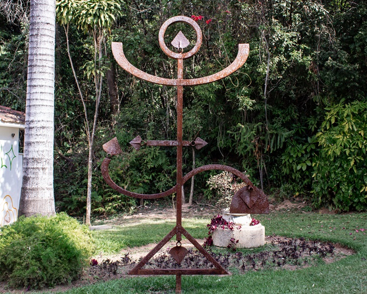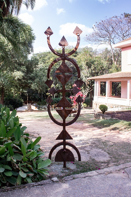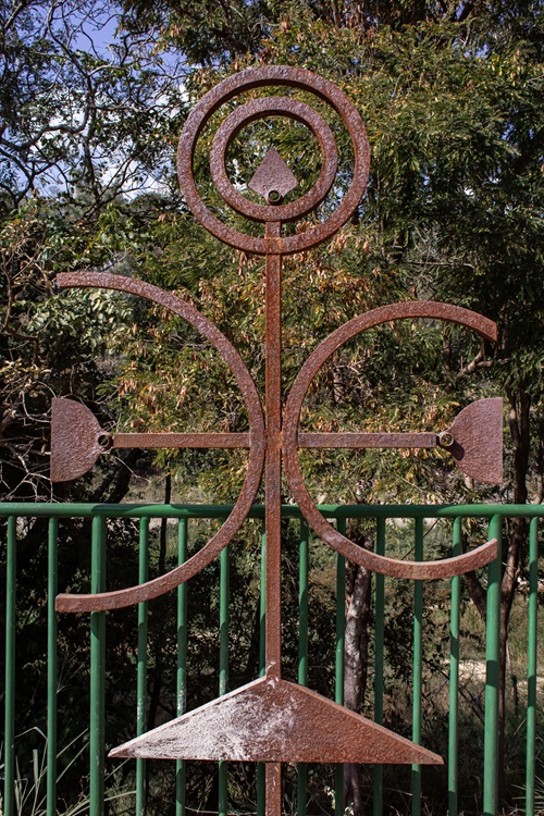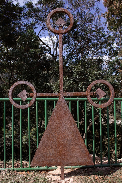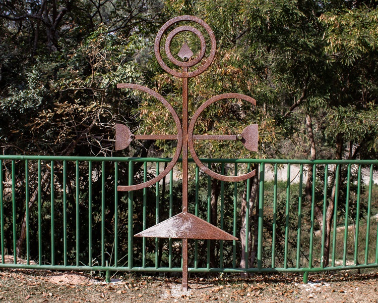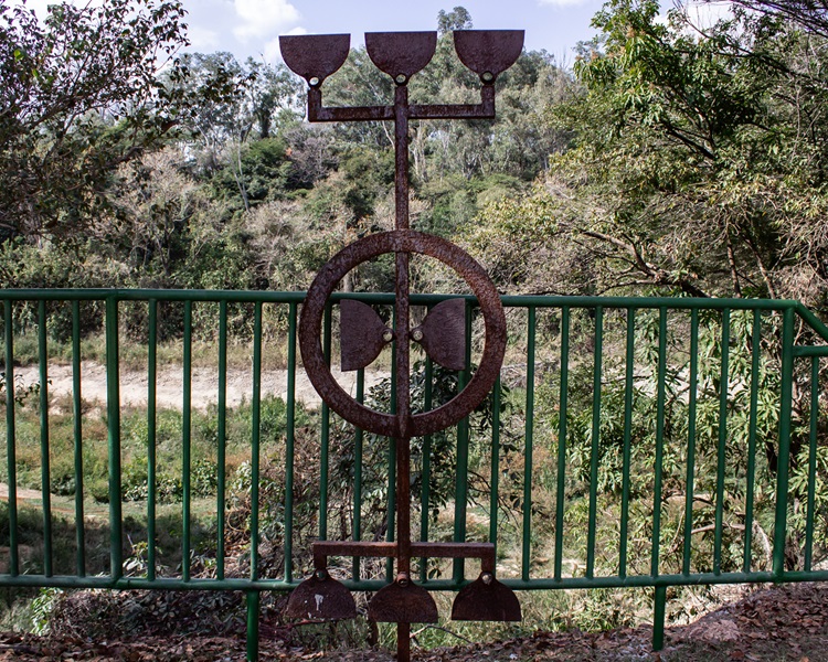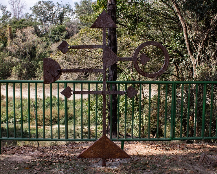 Na instalação que se ergue no Centro de Cultura Popular e Tradicional Lagoa do Nado veremos sob nosso olhar: textura e símbolos em ferro que remetem ao terreno da ancestralidade, como arquétipos oriundos de uma vasta cosmologia. Por outro lado, este “enxadograma” escrito em ferro abre a possibilidade de interação, manuseio, provocações dos sentidos e reflexão histórica, tratando-se de uma oferenda em aço para celebrar as africanidades presentes na cidade de Belo Horizonte e homenagear os homens e mulheres negras que contribuíram com a construção da cidade, tanto do ponto de vista de sua edificação, como na invenção cultural.