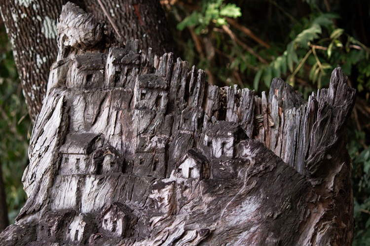 Instalada ao longo de uma alameda do parque, a intervenção reúne 23 esculturas de madeira entalhada que retratam personagens do cotidiano das vilas e aglomerados de Belo Horizonte. Com traços marcadamente negros, as figuras humanas entrelaçadas por casarios e favelas, remetem a uma estética popular, muitas vezes chamada de “naif”, conectada às vivências urbanas e à ancestralidade afro-brasileira.