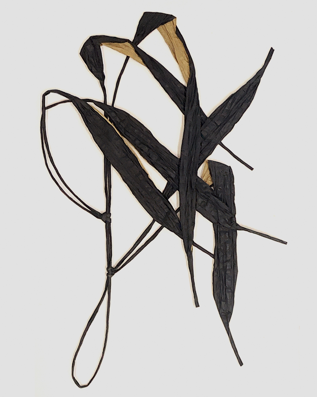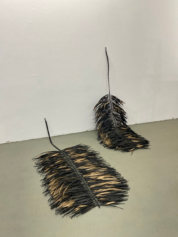 Esculturas da série Diorama lembram tufos de capim que se movem com a circulação dos visitantes, enquanto Invasora atravessa a sala suspensa por fios de aço, como uma trepadeira. Nas paredes, obras pendentes ocupam o espaço como cachos vegetais, e a série Herbário apresenta doze folhas de papel costuradas com fios de papel em composições que evocam estudos botânicos imaginários. No centro, três grandes folhas de palmeira da instalação Volantes descem do teto e ocupam o piso, em uma paisagem inventada.