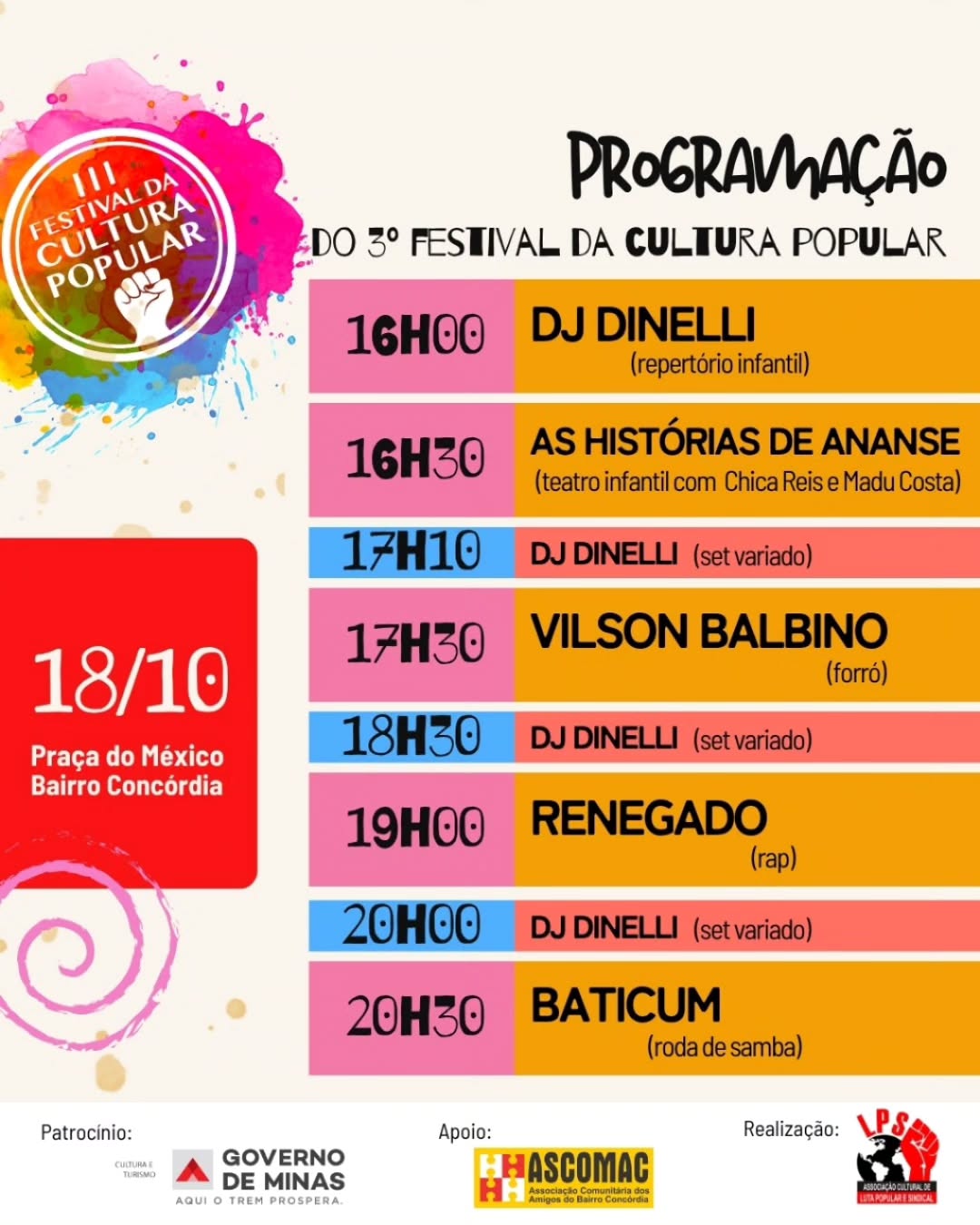 No sábado, dia 18 de outubro, a partir das 16h, na Praça do México do bairro Concórdia.