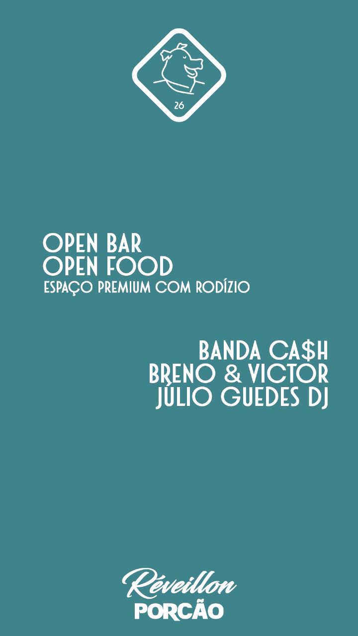 O Jantar Meet terá arroz de camarão, risoto de file com alho poro, penne quatro queijos e a Burgueria oferecerá: mini cheeseburguer Porcão com cheddar, bacon e cebola caramelizada. Pra fechar, tem a Mesa de Café da Manhã O open bar também é caprichado: Whisky Black Label, gin Tanqueray, vodka Ketel One, espumante Porcão, chopp Krug, enegético Red Bull, vinhos tinto e branco, licores Porcão, drinks, caips, refrigerantes, tônica, água mineral e sucos.