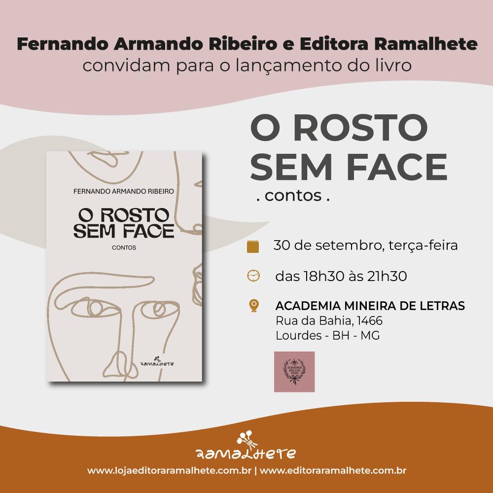 No dia 30 de setembro, terça-feira, às 18h30, a Academia Mineira de Letras (Rua da Bahia, 1466 - BH –MG) recebe a noite de autógrafos e lançamento do livro O rosto sem face, do escritor e professor Fernando Armando Ribeiro. Com prefácio de Luís Giffoni, o livre chega pela Editora Ramalhete.