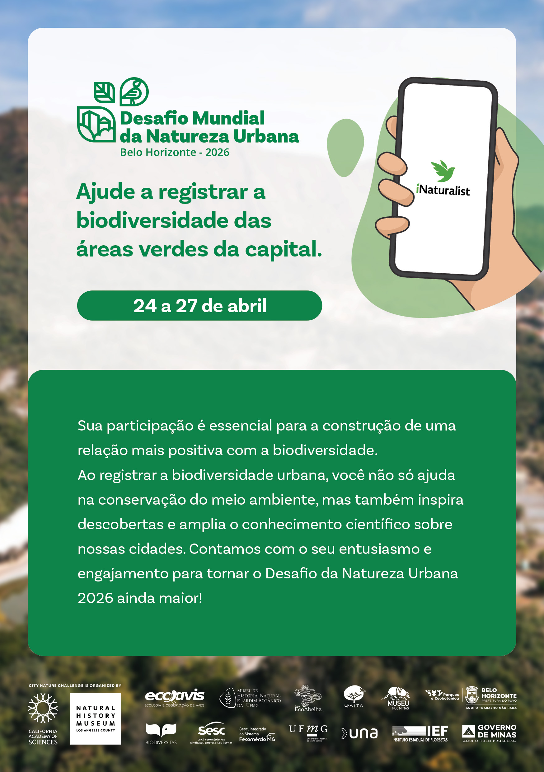 Em 2026, o Desafio Mundial da Natureza Urbana será realizado de 24 a 27 de abril.
