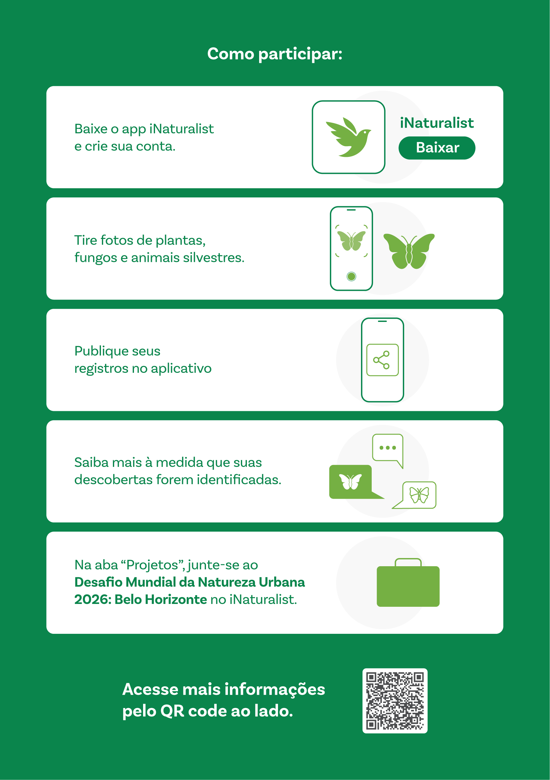 O Desafio Mundial da Natureza Urbana é uma competição urbana amigável de quatro dias na qual participantes de várias cidades ao redor do mundo usam o aplicativo iNaturalist para registrar a biodiversidade de áreas verdes. Os registros se tornam dados para entender e proteger a natureza em todo o mundo. Faça parte desse desafio! Saiba mais clicando aqui.