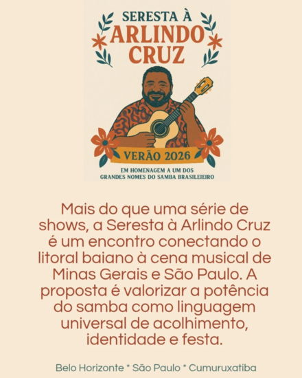 Mais do que uma série de shows, o projeto Seresta à Arlindo Cruz propõe um encontro de gerações e territórios, conectando o litoral baiano à cena musical de Minas Gerais e São Paulo. Seu objetivo é valorizar o samba como linguagem universal de acolhimento, identidade e celebração popular.