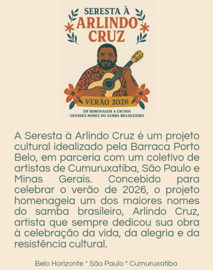 O Seresta à Arlindo Cruz é um projeto cultural idealizado pela Barraca Porto Belo, em parceria com um coletivo de artistas de Cumuruxatiba, São Paulo e Minas Gerais. Criado para celebrar o verão de 2026, o projeto presta homenagem a um dos maiores nomes do samba brasileiro, Arlindo Cruz, artista cuja obra sempre exaltou a vida, a alegria e a resistência cultural.