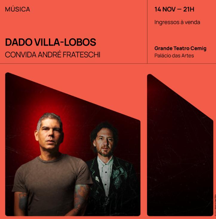 No dia 14 de novembro, às 21h, o Palácio das Artes recebe um encontro memorável da música brasileira: Dado Villa-Lobos convida André Frateschi para um show especial que promete emocionar fãs da Legião Urbana e da trajetória solo do artista.