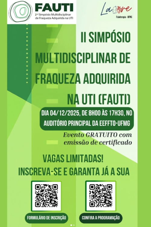 O II Simpósio Multidisciplinar de Fraqueza Adquirida na UTI será realizado no auditório principal da EEFFTO UFMG. O encontro, gratuito e com emissão de certificado, reúne profissionais e pesquisadores interessados em aprofundar o entendimento sobre a fraqueza adquirida na terapia intensiva, tema de grande relevância para a reabilitação e para a qualidade da assistência em saúde.