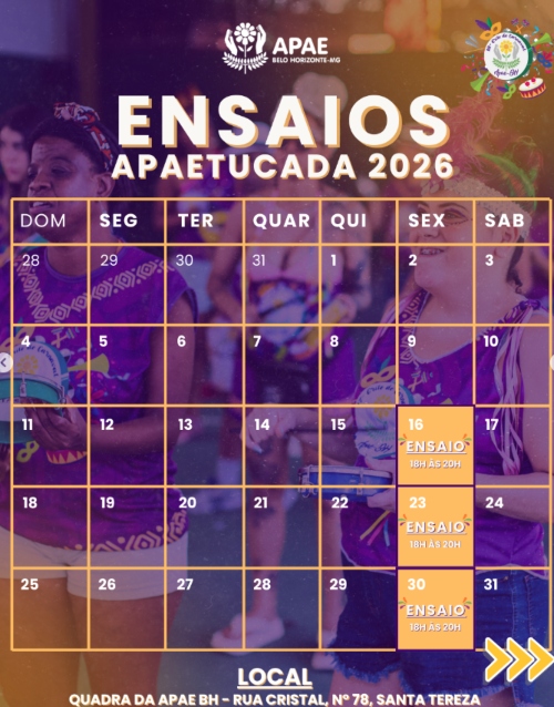 A APAE Belo Horizonte se prepara para mais uma edição vibrante do APAEtucada 2026, um evento que promete encher a cidade de alegria, ritmo e inclusão. Os ensaios acontecem em datas já marcadas ao longo do mês, sempre das 18h às 20h, reunindo participantes, familiares e apoiadores em um clima de celebração e união. O espaço da APAE BH se transforma em um verdadeiro palco de expressão cultural e social, onde cada encontro reforça a importância da convivência e da participação coletiva.