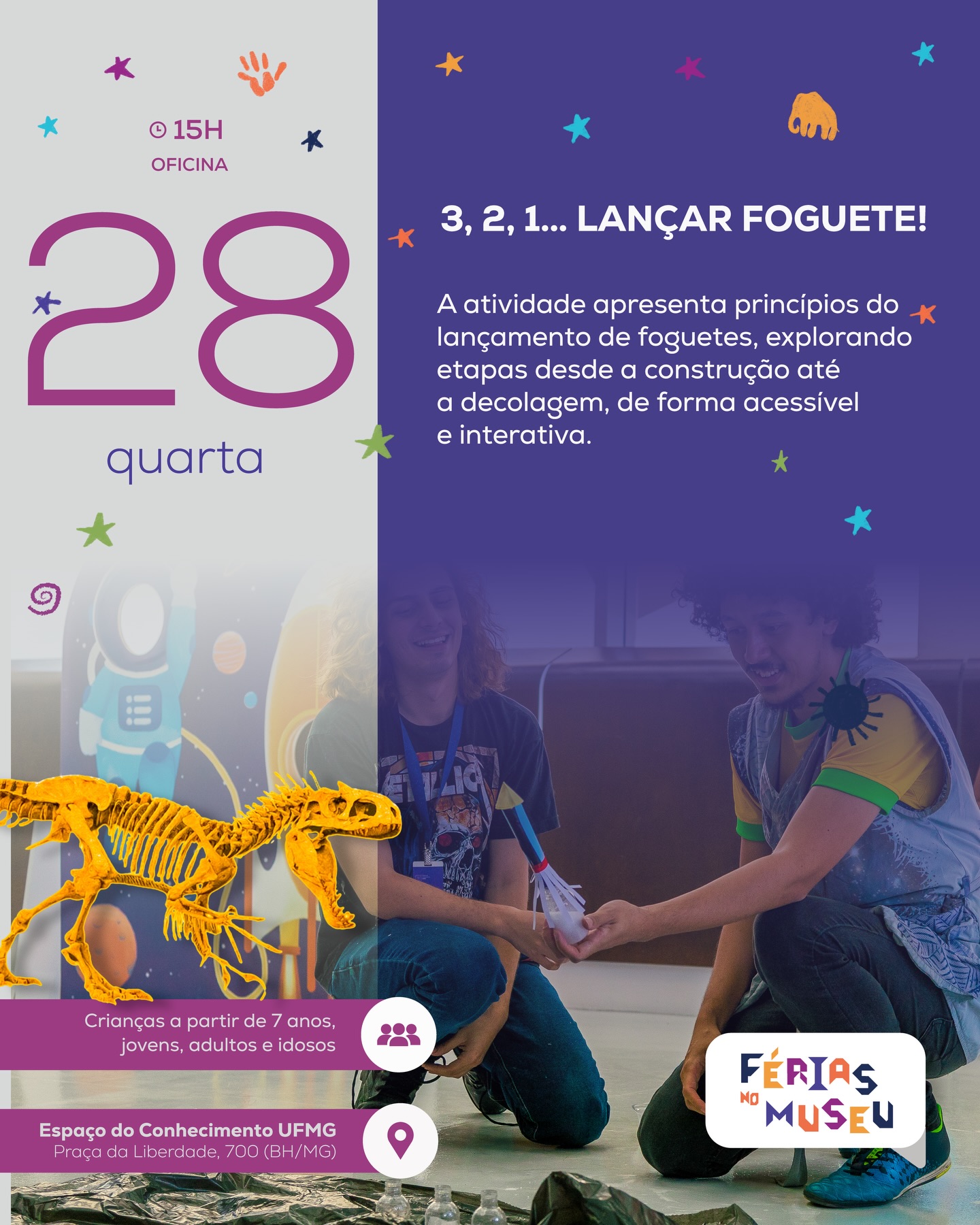 O Espaço do Conhecimento UFMG convida o público para uma experiência cheia de curiosidade e descobertas com a oficina 3, 2, 1… Lançar Foguete!, que acontece na quarta-feira, dia 28, às 15h, como parte da programação especial Férias no Museu. A atividade apresenta, de forma acessível e interativa, os princípios do lançamento de foguetes, explorando as etapas desde a construção até a decolagem, estimulando a imaginação, o pensamento científico e o aprendizado por meio da experimentação. Voltada para crianças a partir de 7 anos, jovens, adultos e idosos, a oficina promove um encontro envolvente entre ciência e diversão, despertando o interesse pelo conhecimento de maneira leve e participativa.