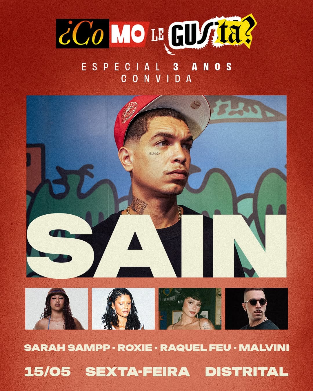 No dia 15 de maio, o público se reúne para celebrar a edição especial de 3 anos da Como Le Gusta, em uma noite que promete marcar a cena com muita música e energia. Entre os destaques da programação está Sain, um dos nomes mais expressivos do rap nacional contemporâneo.