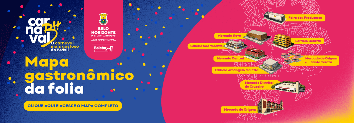 Este guia exclusivo permitirá que os foliões explorem os sabores únicos da nossa cidade enquanto dançam, cantam e se divertem. O Mapa destacará diversos estabelecimentos para comer e beber durante o Carnaval, desde botecos tradicionais como o Bares com Alma, padarias, feiras cobertas, mercados e galerias, até os bares que participarão do Comida di Buteco 2026. Nosso objetivo é fortalecer a imagem de Belo Horizonte como um destino gastronômico de excelência.