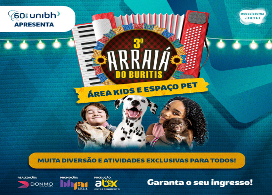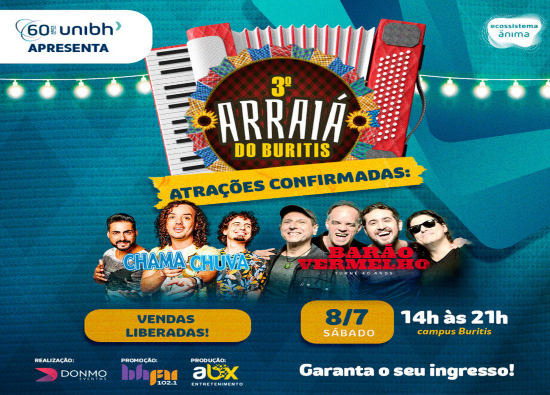 O Arraiá do Buritis chega em sua 3ª. edição com uma programação especial, a tradicional festa junina, acontece no dia 08 de julho, sábado, a partir das 14 horas no Centro Universitário Uni-BH e traz a banda Barão Vermelho e Chama Chuva, além de outras atrações.