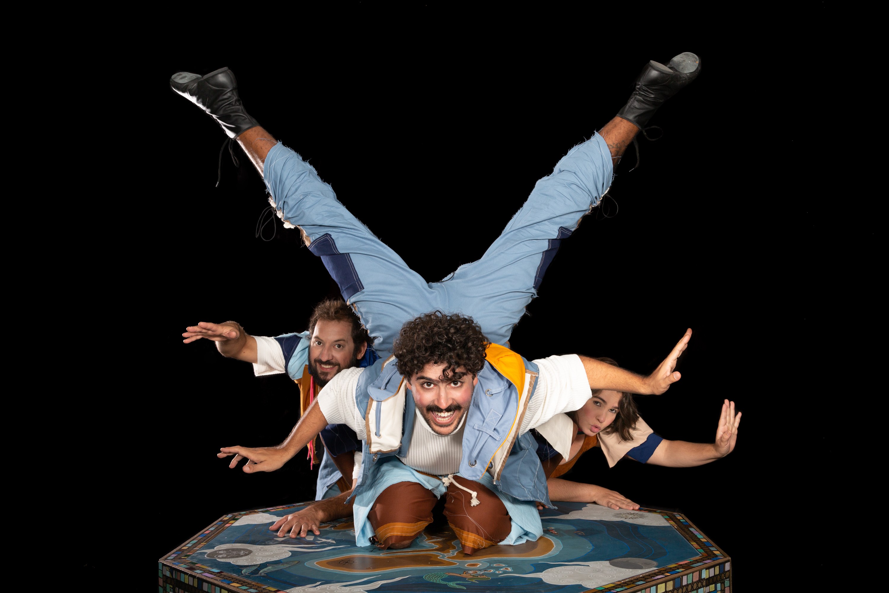 Em cena, brinquedos e objetos são ressignificados, assumindo funções diversas. Tangram, tecidos, tracatraca (escadinha de Jacó), pratos, copos e talheres viram brincadeira nas mãos dos atores. Além de diversos objetos, os atores também manipulam, em cena, uma grande caixa circular que funciona como cenário.