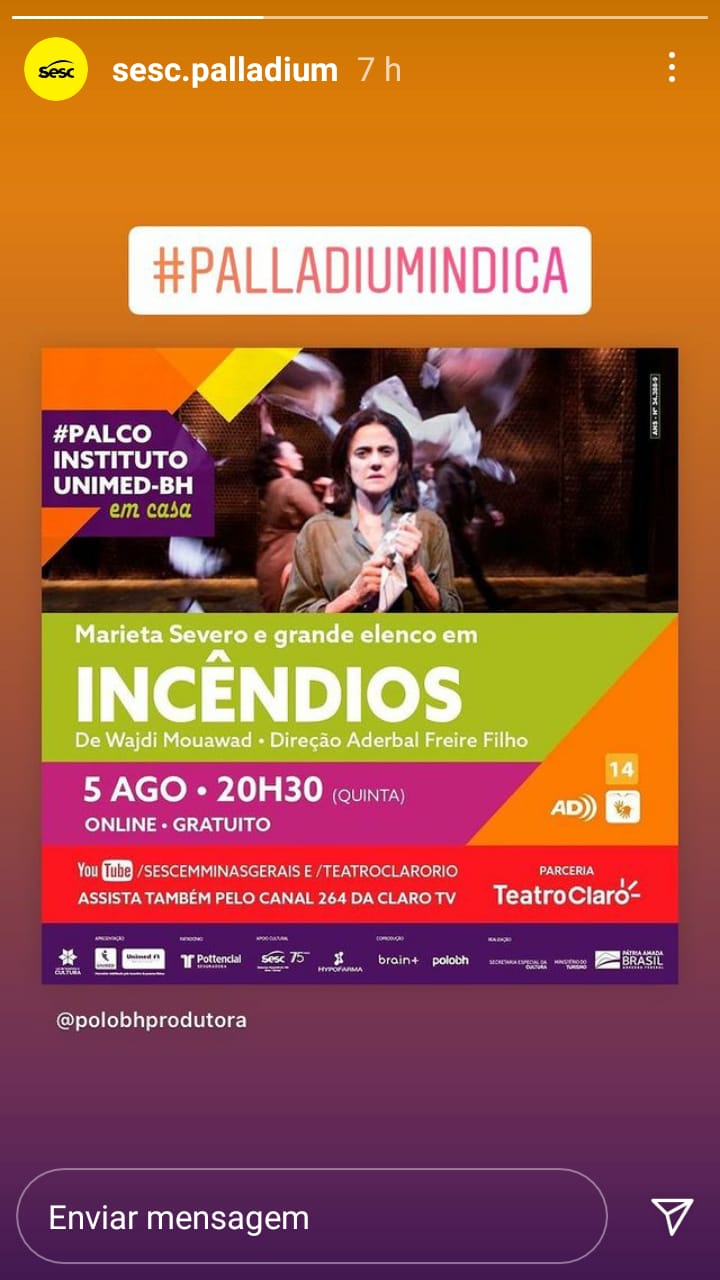 Esse é o enredo do espetáculo “Incêndios”, estrelado por Marieta Severo e dirigido por Aderbal Freire-Filho, que será exibida pelo Palco Instituto Unimed-BH em Casa no dia 05 de agosto (quinta-feira), às 20h30, nos Canais Youtube do Sesc em Minas, Teatro Claro Rio e Pólobh Produtora e pelo Canal 264 da Claro TV.
