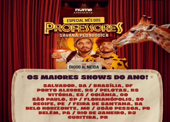 Garanta agora seu lugar e prepare-se para comemorar o mês de Outubro no “Especial Mês dos Professores”, um espetáculo repleto de risadas, aprendizado e reconhecimento com Diogo Almeida, a voz bem humorada da educação brasileira.