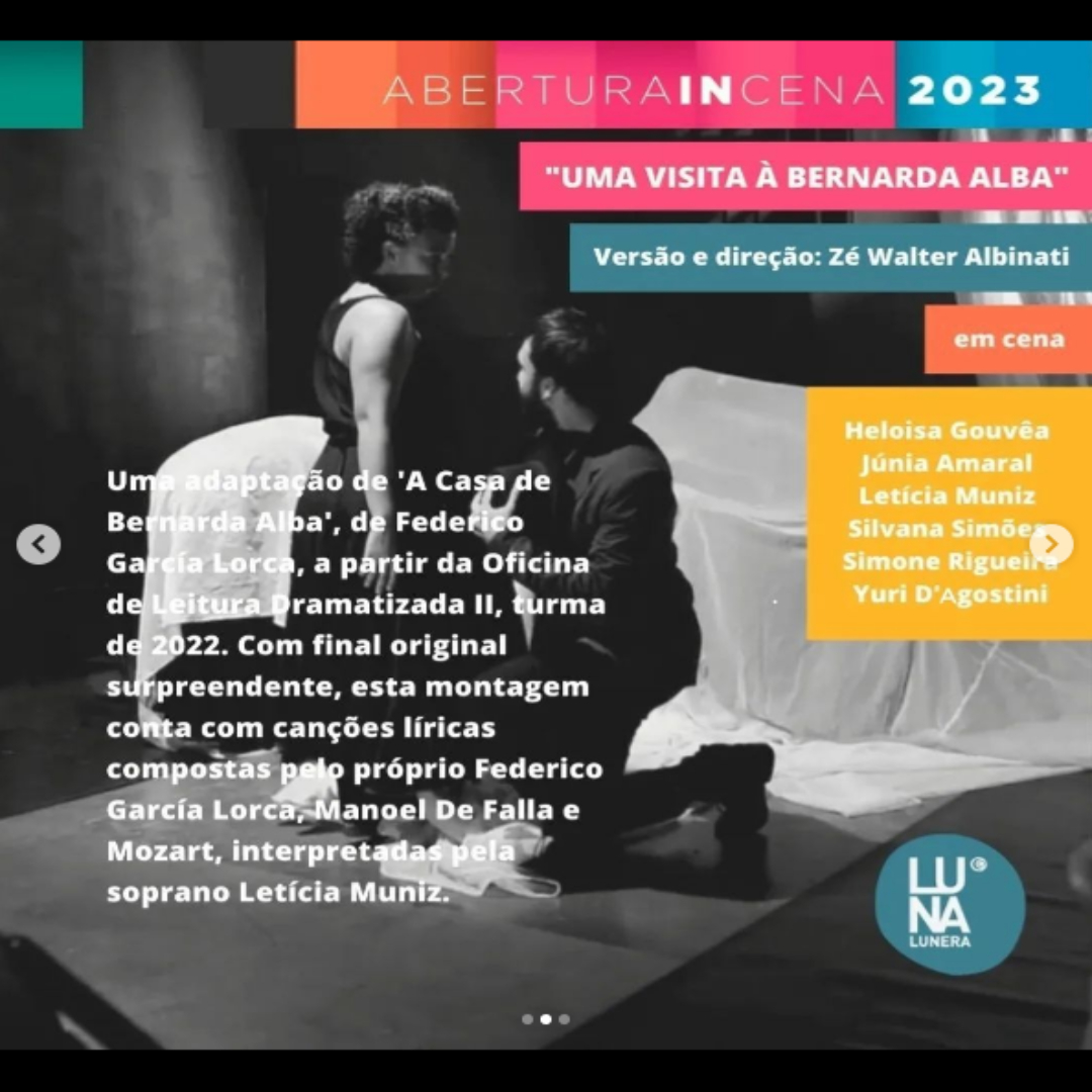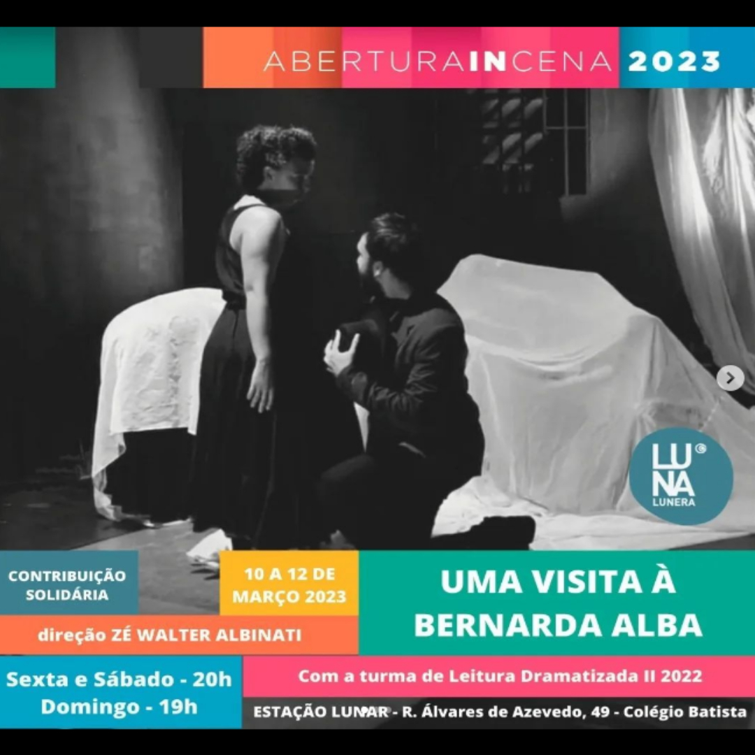 E a abertura das atividades será com 3 apresentações de: "Uma Visita à Bernarda Alba" adaptação de 'A Casa de Bernarda Alba', de Federico García Lorca, com a turma da Oficina de Leitura Dramatizada II (2022), versão e direção Zé Walter Albinati. Montagem itinerante, explorando todos os espaços da Estação Lunar, sede do grupo.