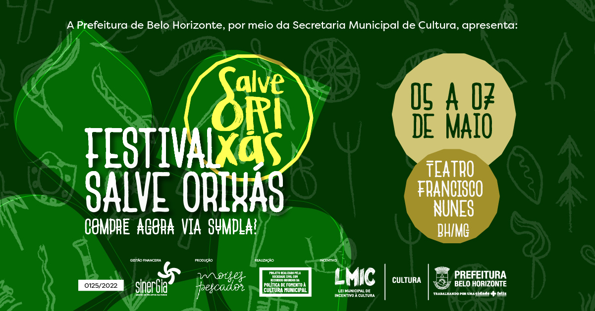 É com muita alegria que anunciamos a segunda edição do Festival Salve Orixás, de 05 a 07 de maio, no Teatro Francisco Nunes, em Belo Horizonte. Será um momento ímpar para homenagear nossas culturas, nutrir nossas raízes e, juntos, construirmos futuros sem preconceitos e intolerância religiosa!