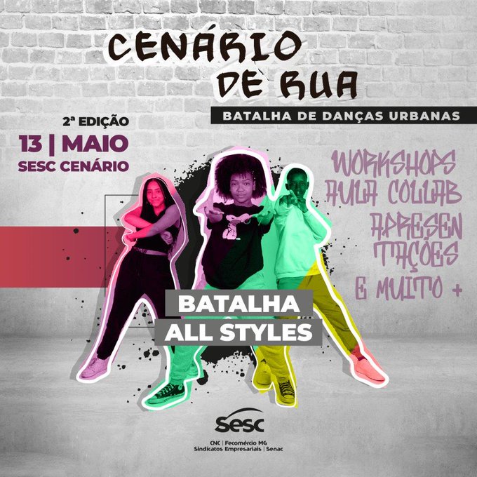 No próximo dia 13/5, das 8h30 às 18h30, acontece a segunda edição do evento “Cenário de Rua”, com competições de danças urbanas (Locking, Popping, Breaking, House, Hip Hop e Dance Hall), no Sesc Cenário. A programação é gratuita na Rua Viana do Castelo, 679, São Francisco.
