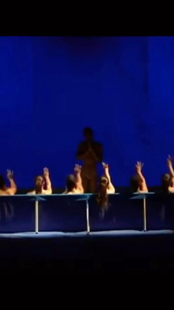 No palco, dentro de uma pequena piscina, bailarinos se locomovem num espetáculo cômico, dramático, caricato e cheio de surpresas.