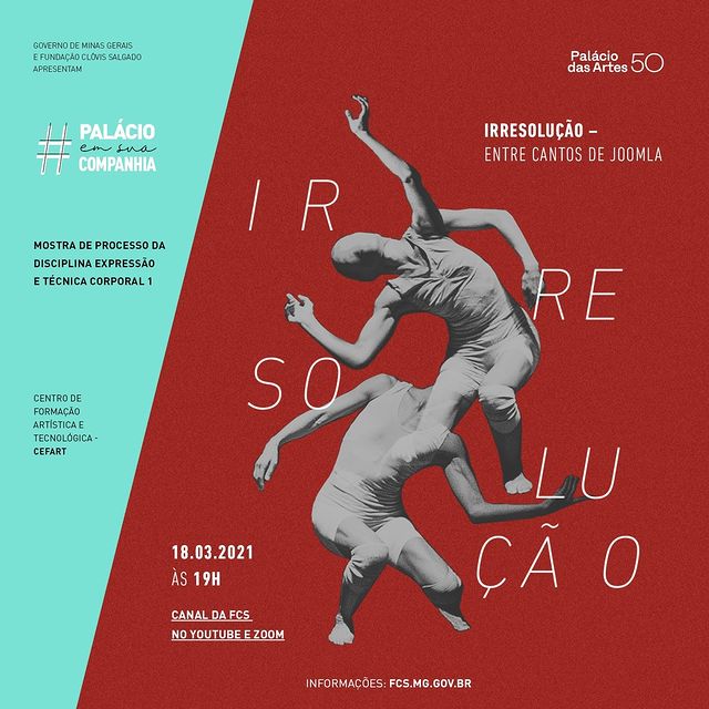 A Fundação Clóvis Salgado, por meio da disciplina de Expressão e Técnica Corporal ministrada pelo Cefart, convida a todos para a exibição do vídeo “Irresolução – entre cantos de Joomla”, amanhã (18), às 19h, no canal da FCS no YouTube e na plataforma Zoom.