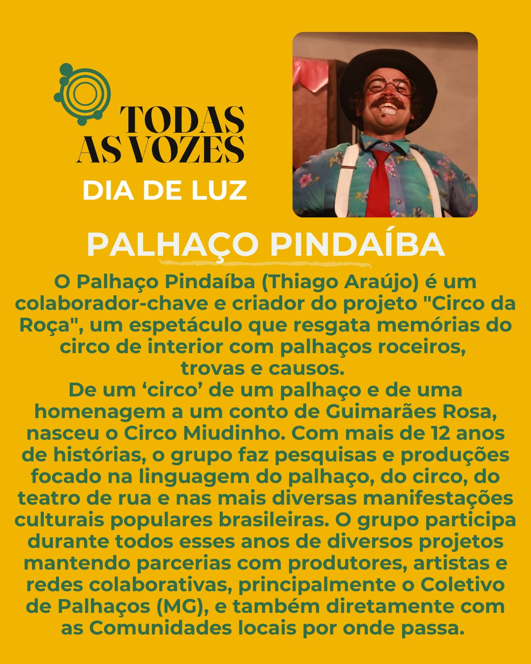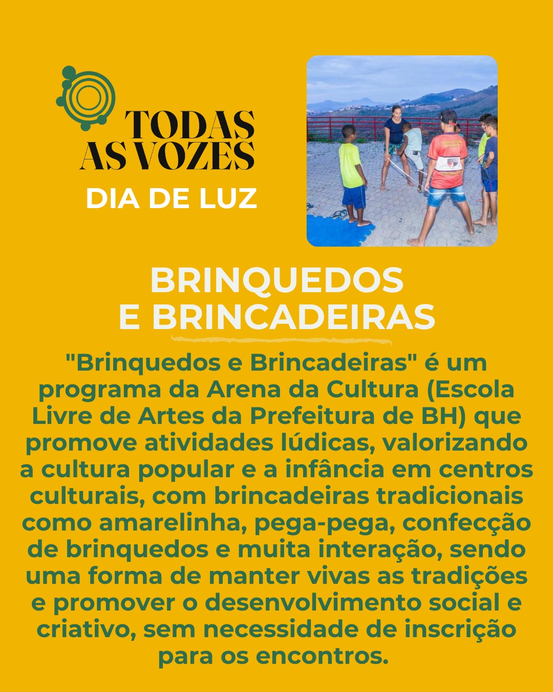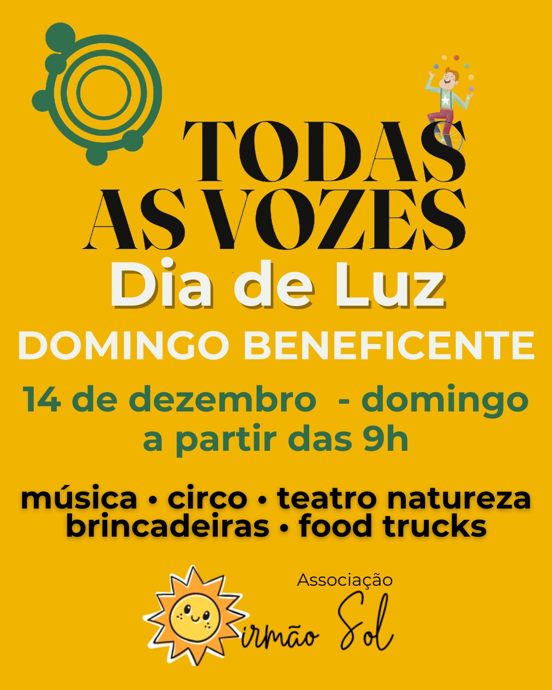 O projeto Todas as Vozes realiza o Dia de Luz, um domingo beneficente criado para acolher crianças da Associação Irmão Sol e de outros orfanatos em uma programação repleta de brincadeiras, circo, música e contato com a natureza. A proposta convida as famílias a participarem de um momento de partilha e alegria, que também inclui a arrecadação de brinquedos, material escolar, itens de limpeza e alimentos não perecíveis.