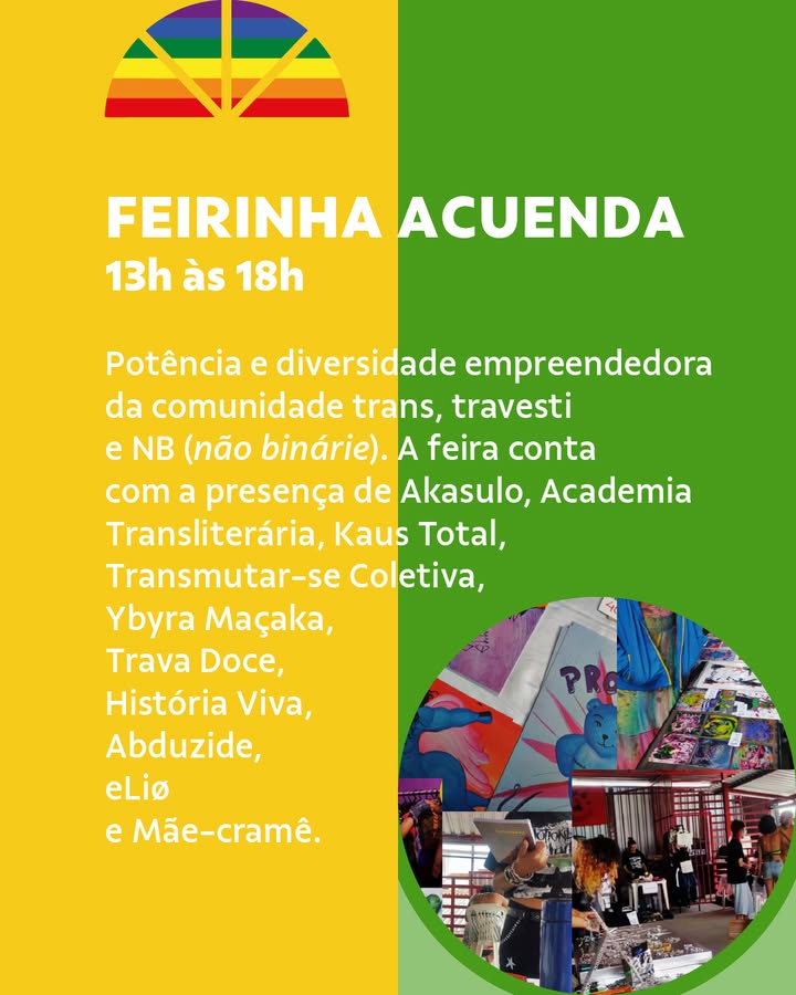 A programação foi pensada para dar visibilidade a essas vozes, que muitas vezes são silenciadas”, diz A tarde será marcada por pocket shows que se alternam entre ritmos, territórios e linguagens artísticas. A cantora Bahia, de Manhuaçu, abre a programação com sua sonoridade afro-pop que transita entre o popular e o ancestral. Akin Zahin trará uma mistura R&B, funk e hip-hop com letras sobre autoestima, amor, desejo e força, refletindo suas raízes periféricas, originárias e negras. Com passagens pelos blocos Daquele Jeito e Pérola Negra, ela transforma suas referências em músicas que exaltam a força da mulher negra. O poeta e músico Nilo Ybyra, conhecido como PI ETA POETA, bicampeão mundial de poesia falada, apresenta composições que cruzam influências indígenas e africanas em uma estética marcada pela oralidade e força cênica — suas obras já foram reconhecidas por veículos como Billboard e The New York Times. A coletiva Fanchecléticas, da Associação Artes Sapas, traz ao palco a potência de artistas lésbicas, bissexuais, trans, travestis e não binárias em uma apresentação plural e afetiva, que atravessa linguagens como a performance, a música e a poesia. Já a multiartista Xiatitia, travesti negra, periférica e campeã do Trans Slam Internacional 2023, usa a palavra falada como instrumento de combate e emancipação, mesclando beats e poesia em uma presença de palco marcante e politizada. Na sequência, Lua Zanella, MC, cantora e compositora, apresenta músicas de seu recém-lançado álbum “TRANSMACHINE”, em que aborda as vivências de um corpo travesti. Fechando a sequência de pockets, as multiartistas Paloma Alves e Zaíra Magalhães, do projeto Las Palozas, conduzem o público por um set dançante e afetivo que valoriza sons das periferias, negritudes e juventudes queer. Enquanto os shows acontecem, o público poderá circular pela Feirinha Acuenda, das 13h às 18h, reunindo mais de dez marcas e coletivos liderados por pessoas trans, travestis e não binários.