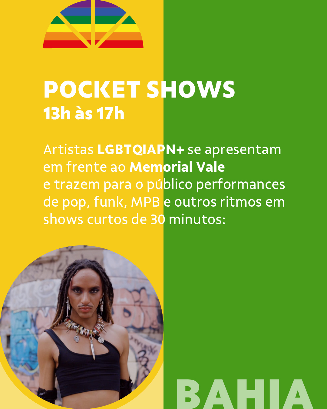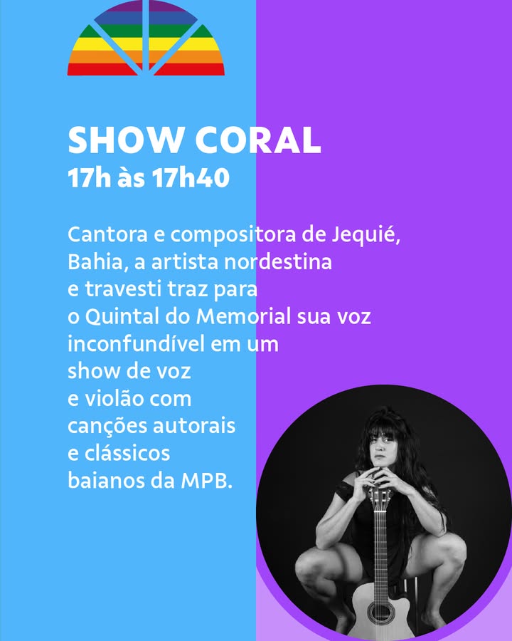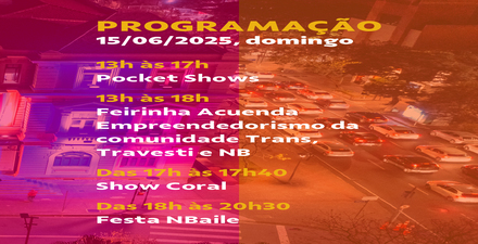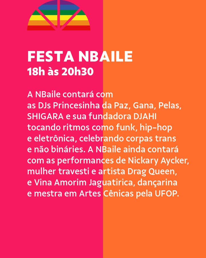 A feira propõe um mergulho na diversidade produtiva dessa comunidade, com itens que vão da arte visual à literatura independente, da moda autoral à gastronomia. Participam nomes como Akasulo, Academia Transliterária, Kaus Total, Transmutar-se Coletiva, Ybyra Maçaka, Trava Doce, História Viva, Abduzide, eLiø e Mãe-cramê. Às 17h, sobe ao palco a cantora e compositora Coral, artista travesti de Jequié, na Bahia, que apresenta um show de voz e violão no qual entrelaça canções autorais com clássicos baianos da MPB. Coral é conhecida por sua voz marcante e pela delicadeza com que traduz vivências da comunidade LGBTQIAPN+ nordestina em sua música. Encerrando a programação, das 18h às 20h30, o público será convidado para o NBaile, uma grande celebração comandada por DJs trans e não binários, como Princesinha da Paz, Gana, Pelas e a fundadora do projeto, DJAHI (Jahi Amani). Misturando batidas de funk, hip-hop e música eletrônica, o baile é um espaço de liberdade e afirmação de corpos dissidentes. As apresentações contam ainda com as performances da drag queen Nickary Aycker, artista premiada e ativista dos direitos LGBTQIAPN+, e da dançarina e pesquisadora Vina Amorim Jaguatirica, mestra em Artes Cênicas pela UFOP, que leva ao palco um corpo em movimento repleto de ancestralidade e potência.
