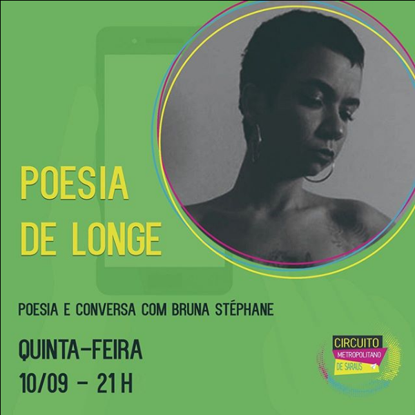 Próxima quinta tem mais uma edição de Poesia de Longe! Dessa vez com a Bruna Stéphane. Artista visual e poeta marginal que recolhe e deposita poesia no papel, nos saraus/slams e na vida - professora, pesquisadora e doutoranda em Estudos Literários nas horas vagas. Se debruça no feminino para pintar-escrever-performar-(re)pensar corpos-mulheres fortes, livres e insubordinados.