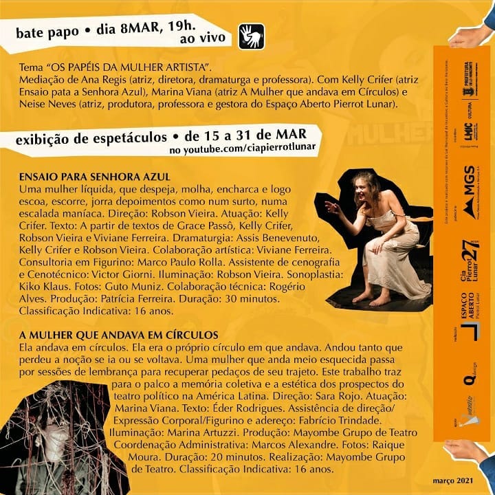 O Espaço Aberto Pierrot Lunar segue em sua programação ao retomar o evento “Mulheres em Cena” que, em seu formato presencial, convidava espetáculos teatrais que tinham a mulher artista em uma ou mais funções dedicadas à cena, com temas relevantes ao universo feminino.
