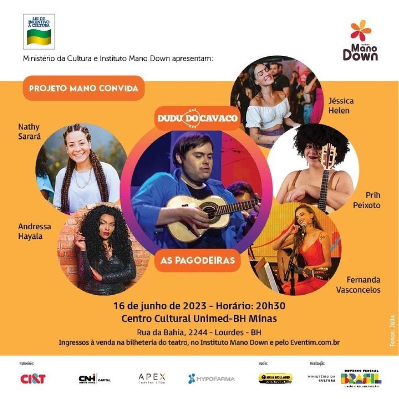 No dia 16/6, sexta-feira, às 20h30, o Teatro do Centro Cultural Unimed-BH Minas recebe o show do projeto “Mano Convida” em que o cavaquinista Dudu do Cavaco convida o grupo “As Pagodeiras”.