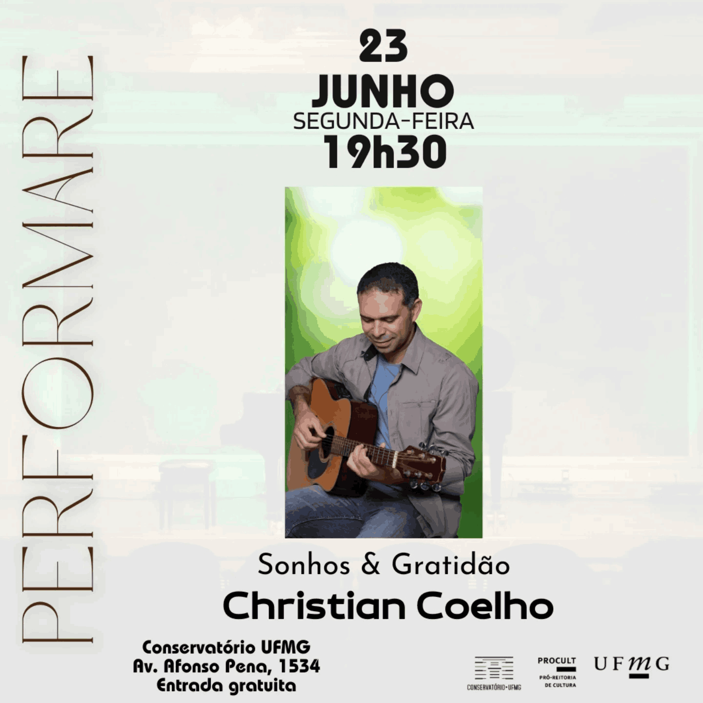 Na próxima segunda-feira (23/06), às 19h30, o Conservatório UFMG recebe o recital de formatura “Sonhos & Gratidão”, apresentado pelo violonista e guitarrista Christian Coelho (@christian_oficial), que celebra seus 25 anos de trajetória na música ao lado de convidados.
