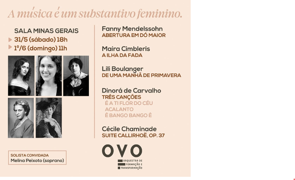 No programa, obras de cinco artistas que marcaram a história: Fanny Mendelssohn (1805-1847), Lili Boulanger (1893-1918), Cécile Chaminade (1857-1944) e as mineiras Dinorá de Carvalho (1895-1980) e Maíra Cimbleris (1979). Sob a regência de Werner Silveira e com participação da soprano Melina Peixoto, o concerto conta com mediação e comentários sobre cada obra, de modo a promover um diálogo direto entre o público e os artistas.