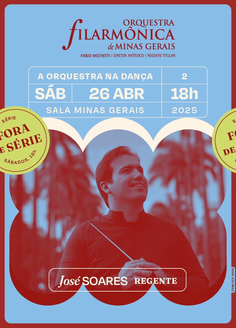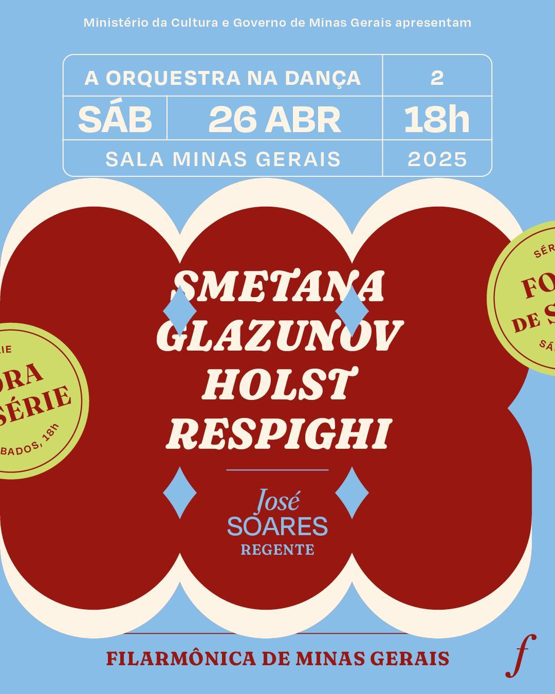 Na próxima edição do Fora de Série, no dia 26 de abril, a Orquestra mergulha em composições repletas de lirismo e movimento. Sob o comando do maestro José Soares, apresentaremos obras encantadoras de Smetana, Glazunov, Holst e Respighi, em um mosaico sonoro de danças de diferentes povos e culturas. O evento terá danças de origem polonesa, tcheca, italiana e de inspirações árabes e japonesas, em uma noite que promete encher a Sala Minas Gerais de música e alegria.