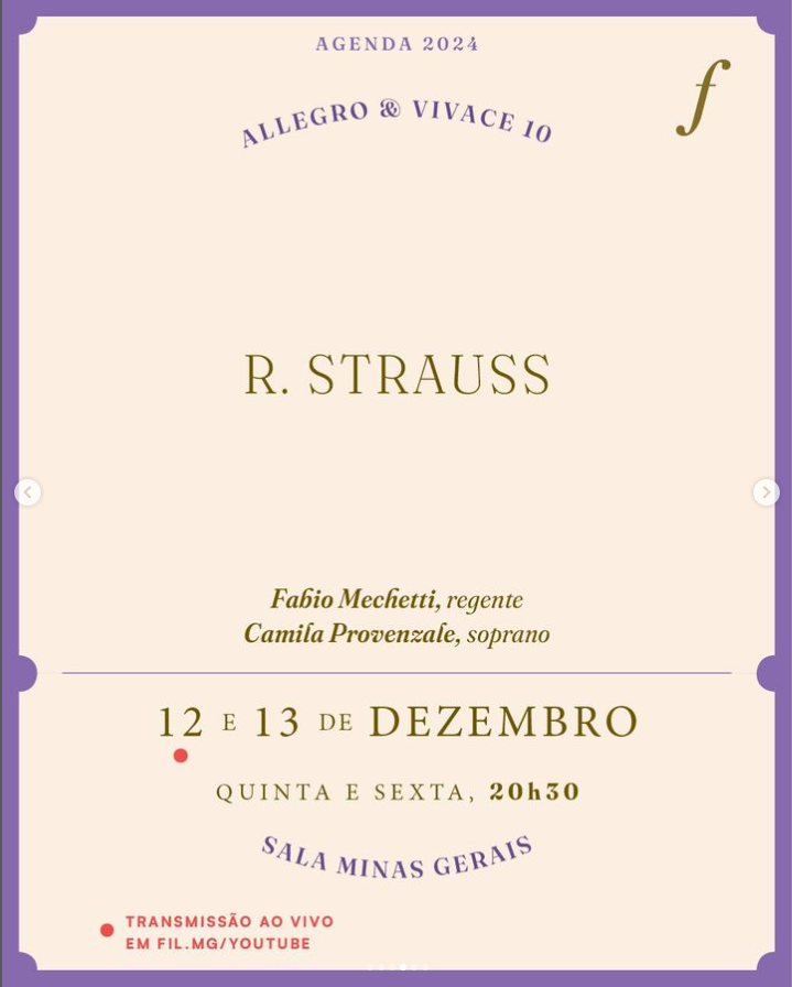 Na semana seguinte, nos dias 12 e 13, celebramos uma última vez o aniversário de 75 anos de morte de Richard Strauss com um programa inteiramente dedicado à sua obra, que inclui a Suíte de sua popular ópera “O cavaleiro da rosa” e a participação da soprano Camila Provenzale cantando as suas belíssimas “Quatro Últimas Canções”.