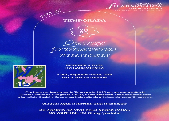 Neste mês também teremos a série Filarmônica em Câmara, dia 11, e, em seguida, os grupos de câmara seguem para uma programação fora da Sala Minas Gerais.